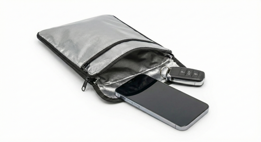 - Bolsas de Faraday: Feitas com malhas metálicas condutoras, essas bolsas bloqueiam 100% dos sinais (celular, Wi-Fi, Bluetooth, GPS) que entram ou saem do seu smartphone, tablet ou chave do carro, impedindo rastreamento remoto ou acesso indevido.